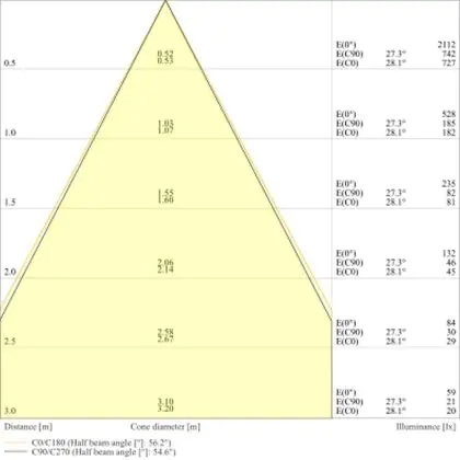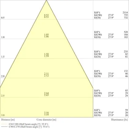 De lichtopbrengst en de gradenbundel spelen een grote rol. Zo geeft de lichtopbrengst van 540 Lumen in combinatie met de 60° stralingshoek deze inbouwspot een specifieke toepassing. Kort samengevat is een lichtintensiteit van maximaal 400 Lumen ideaal voor accentverlichting, terwijl hogere waardes goed gebruikt kunnen worden als basisverlichting. Over het algemeen geldt: hoe breder de gradenbundel, hoe geschikter deze is door basisverlichting. Dit komt doordat het licht over een groter oppervlak wordt verspreid. Smallere gradenbundels (tot 40°) kunnen echter bij hoge plafonds ook goed tot hun recht komen als algemene verlichting.