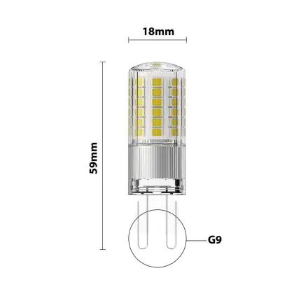 Om tot de meest geschikte G9 LED steeklamp te komen, is het handig om een aantal dingen te checken. Te beginnen met de kleurtemperatuur. Die is bij dit product: 3000K - Warm Wit. Wil je liever een andere kleurtemperatuur? Gebruik dan het filter 'Lichtkleur' aan de linkerkant van onze G9 LED Lampen pagina. Ook raden we aan om altijd de afmetingen van dit LED product te vergelijken met je huidige G9 lamp. De diameter is: mm en de hoogte is: 59mm.